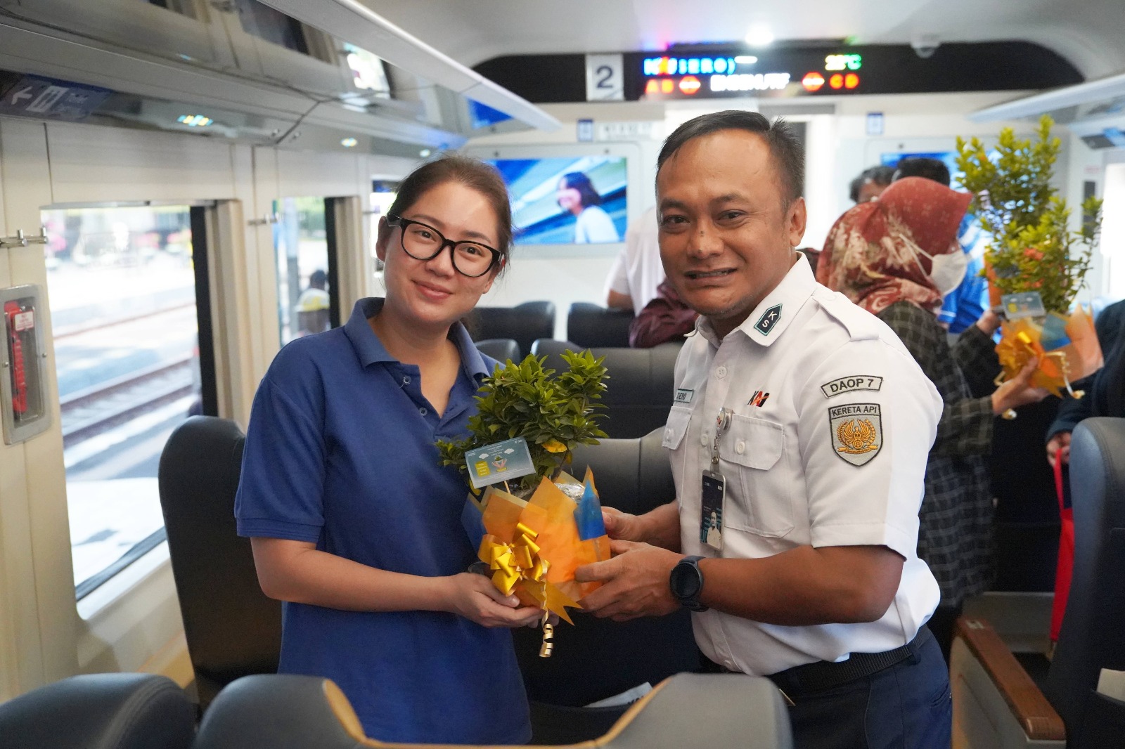 “Guna menjaga lapisan ozon serta kualitas udara, Daop 7 Madiun membagikan puluhan bibit pohon buah dan tanaman hias kepada para calon penumpang KA. Selain itu, dibagikan pula aneka barang kerajinan yang terbuat dari limbah atau sampah plastik daur ulang,” orang Zainul.